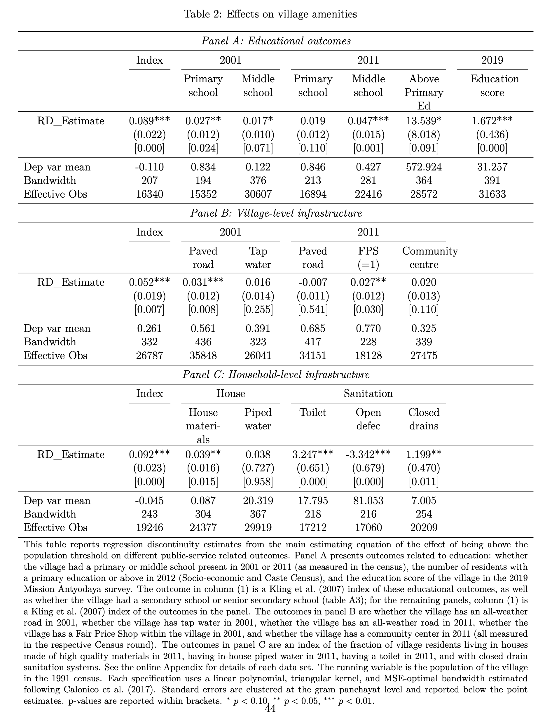 - 教育基础设施:村庄被划分到较小的政体中时,这些村庄的教育基础设施指数显著增加(提高了0.089个标准差);在短期和长期的情况下,小政体的教育可得性都更高。