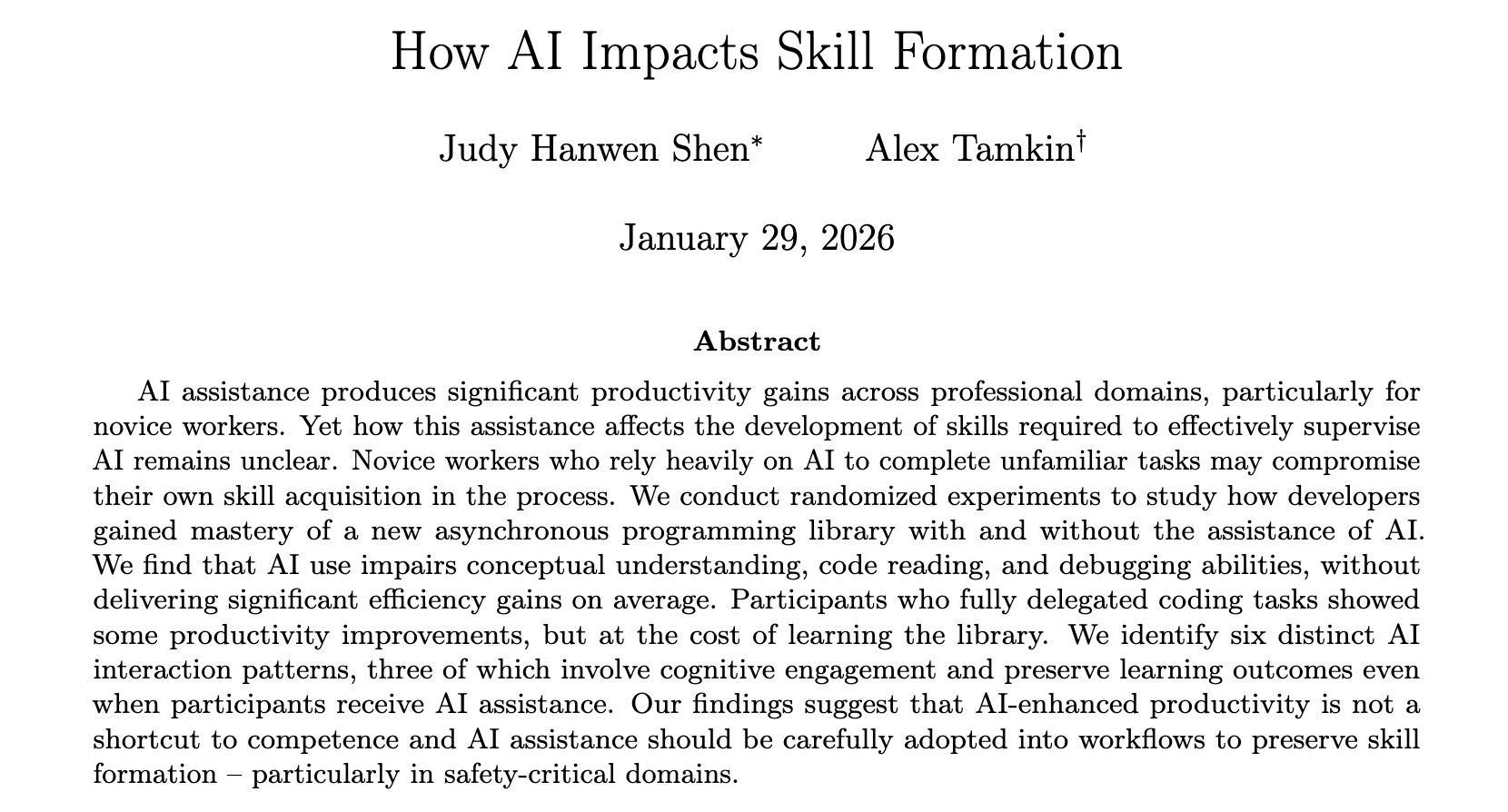 Shen, J. H., & Tamkin, A. (2026). How AI Impacts Skill Formation. arXiv preprint arXiv:2601.20245. https://arxiv.org/abs/2601.20245