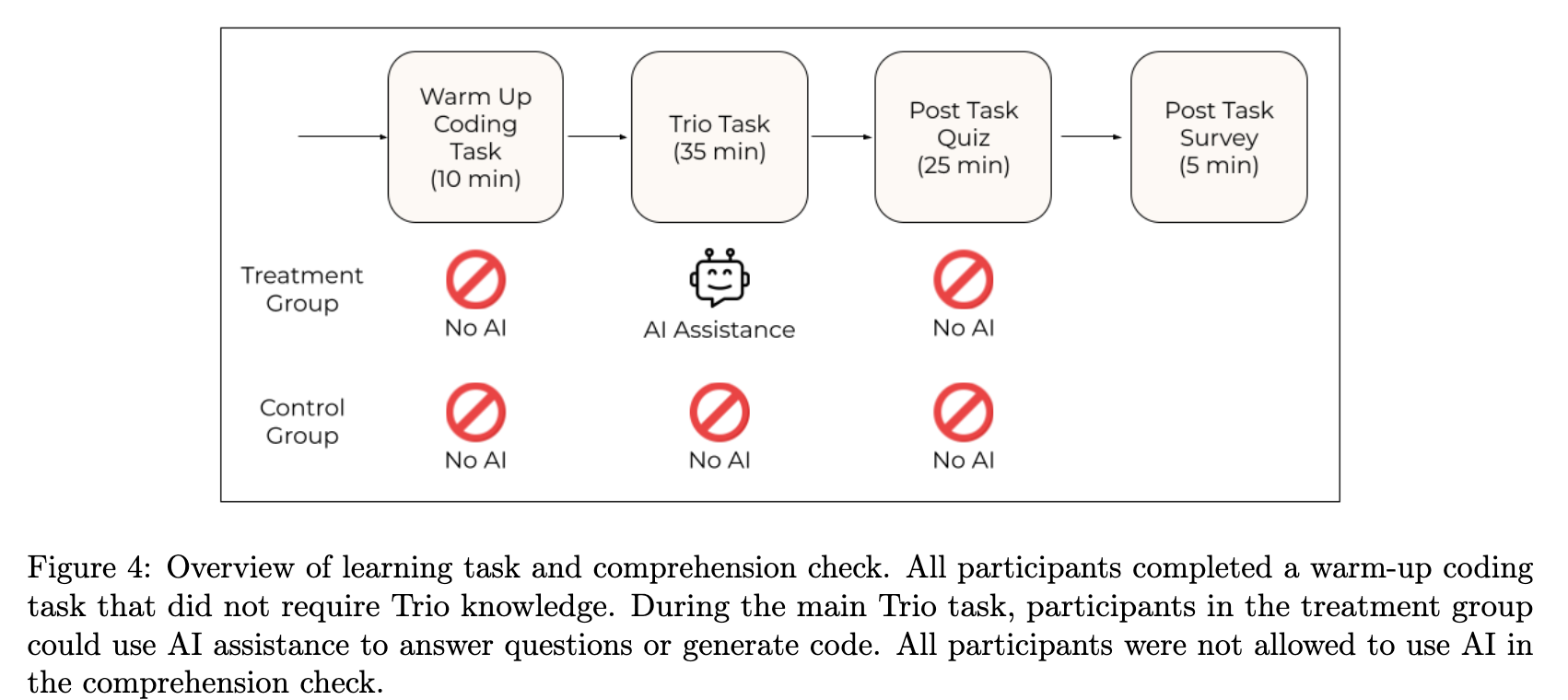 基于这些理论,作者提出了核心假设:直接使用AI生成代码,可能使用户跳过了学习循环中的关键环节,尤其是通过解决错误和独立思考来进行反思和概念化的过程,从而阻碍了深层次的技能形成。换言之,AI可能提供了一条捷径,让用户绕过了那些虽然困难但对学习至关重要的认知过程。