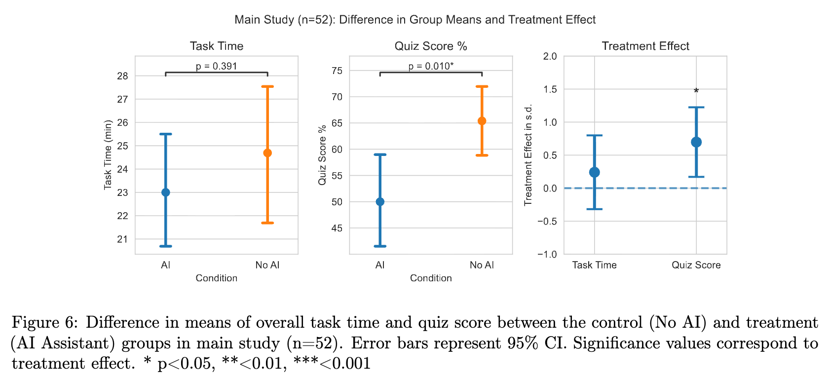 这一结果表明,尽管AI帮助部分参与者完成了任务,但这个过程并没有有效地转化为他们自己的知识和技能。换言之,AI辅助带来的是一种表面成功,任务完成了,但学习并未发生。