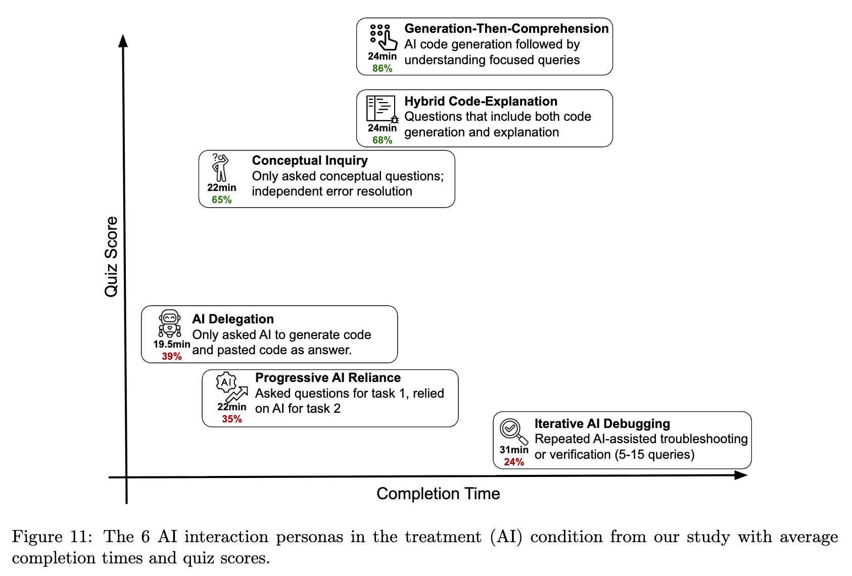 在使用AI的参与者中,技能形成结果在高分交互模式(65%-86%测验分数)与低分交互模式(24%-39%测验分数)之间存在明显分化。高分者只向AI提出概念性问题而不是代码生成,或者要求解释伴随生成的代码;这些使用模式展示了高水平的认知参与。